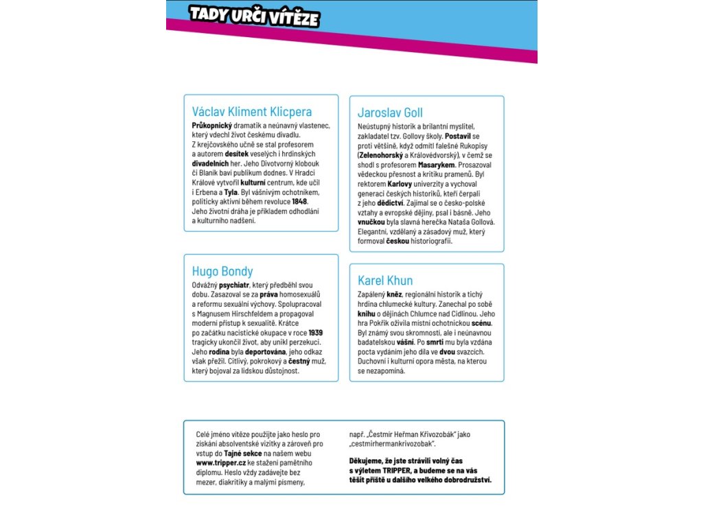 Chlumec nad Cidlinou je známý nejen jako místo, kde došlo k porážce selského povstání. Je to místo, odkud pochází celá řada osobností, které přispěly k rozvoji české vědy i kultury. Jednu takovou čtveřici velikánů vám dnes představíme. Vaším úkolem je během procházky městem a zámeckým areálem nasbírat indicie, které vám prozradí, kterou osobnost dnes představíme podrobněji. Je to ta, u které vyškrtnete pět pojmů.