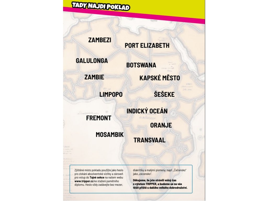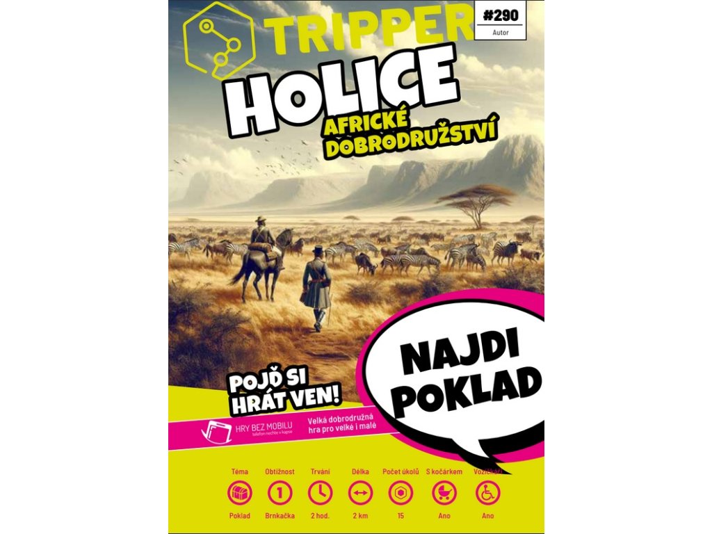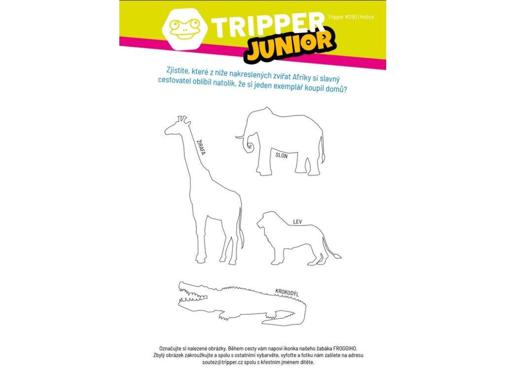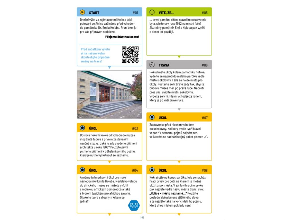 Vydejte se s námi po stopách slavného cestovatele Emila Holuba, který se narodil právě v Holicích. Během putování po zajímavých místech tohoto malebného města odhalíte celou řadu míst, která jsou spojena s africkými výpravami slavného cestovatele. Vyškrtejte zeměpisné pojmy a ten, který vám zbyde, ukrývá dnešní poklad v podobě hesla do tajné sekce, ve které se dozvíte o afrických dobrodružstvích Emila Holuba a jeho polečníků.