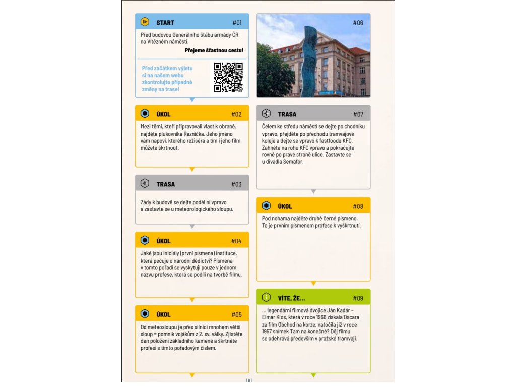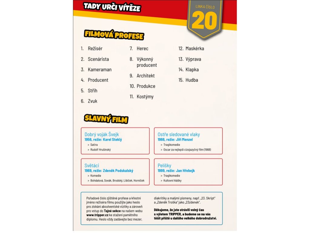 Během cesty budete zjišťovat indicie pro zjištění filmového povolání a jméno jednoho režiséra. Nemusíte celou cestu projít pěšky, můžete kromě tramvaje (samozřejmě nejlépe linkou 20) využít i další druhy MHD 😊. Šťastnou cestu!
