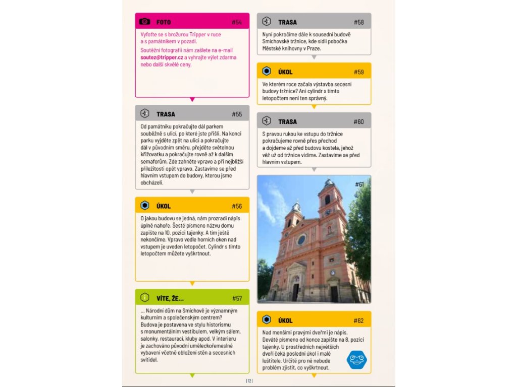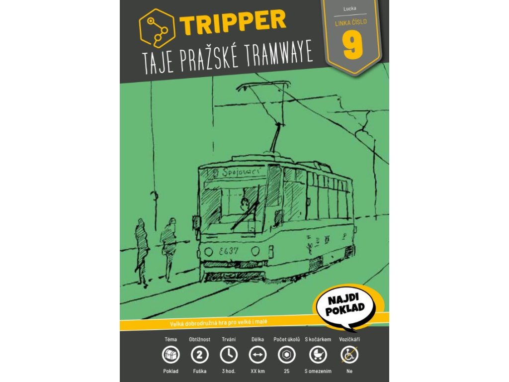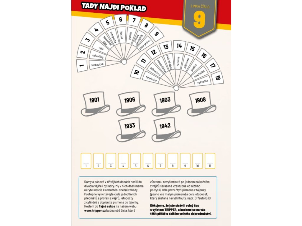 Celou trasu si projedeme a projdeme při hře Tripper. Přenesme se společně do minulého století, kdy dámy do divadel nosily vějíře a pánové cylindry. Naším úkolem bude pomoci jedné tajemné dámě. Chystá se na premiéru filmu, na kterém se podílela. Avšak ztratila důležitý doplněk, zvládnete ho vypátrat a zároveň zjistit, o koho se jedná, odhalit její profesi i ve kterém roce se nacházíme? Hodně štěstí v pátrání a ať dámu nezklameme.