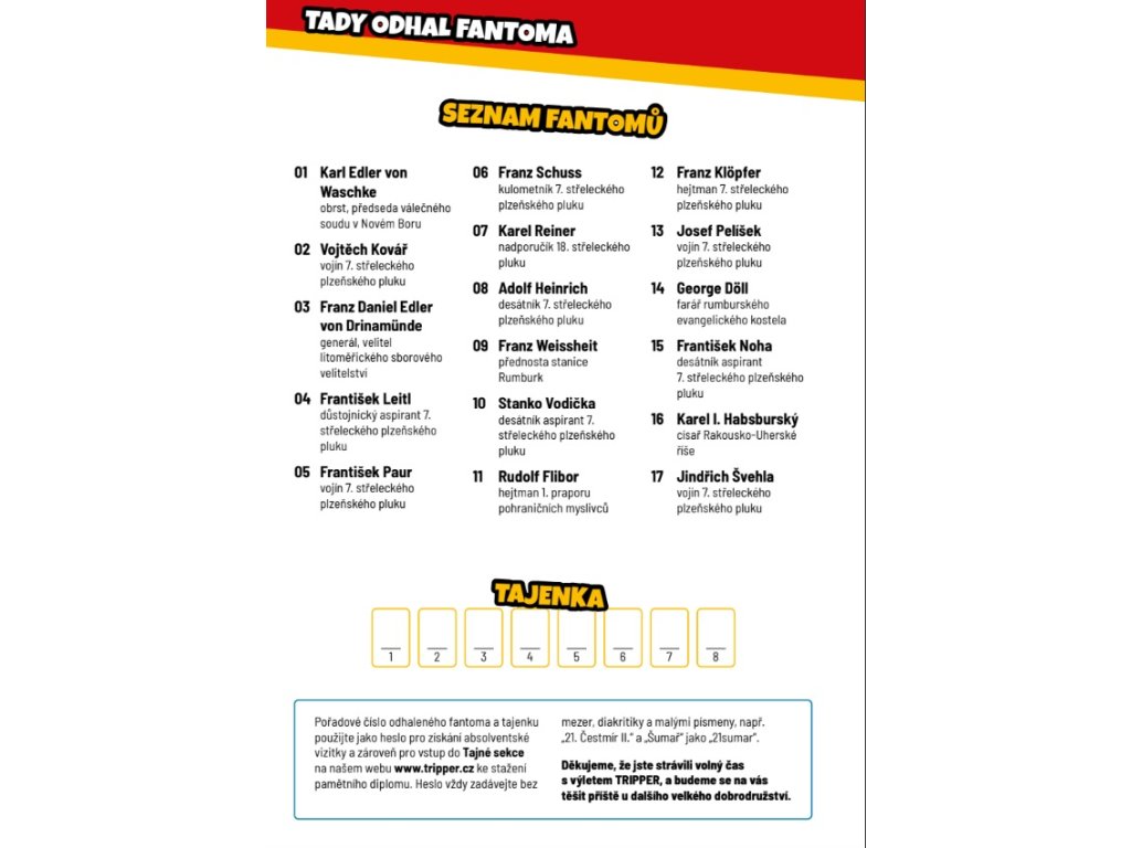 Když jim velitel setniny Franz Klöpfer začne sprostě nadávat, z čety se ozve lakonické: „Hoď mu ji.“ Rumburská vzpoura právě začíná... Vydejte se s námi na putování po stopách této jedinečné historické události a sbírejte indicie pro odhalení fantoma a tajenky.