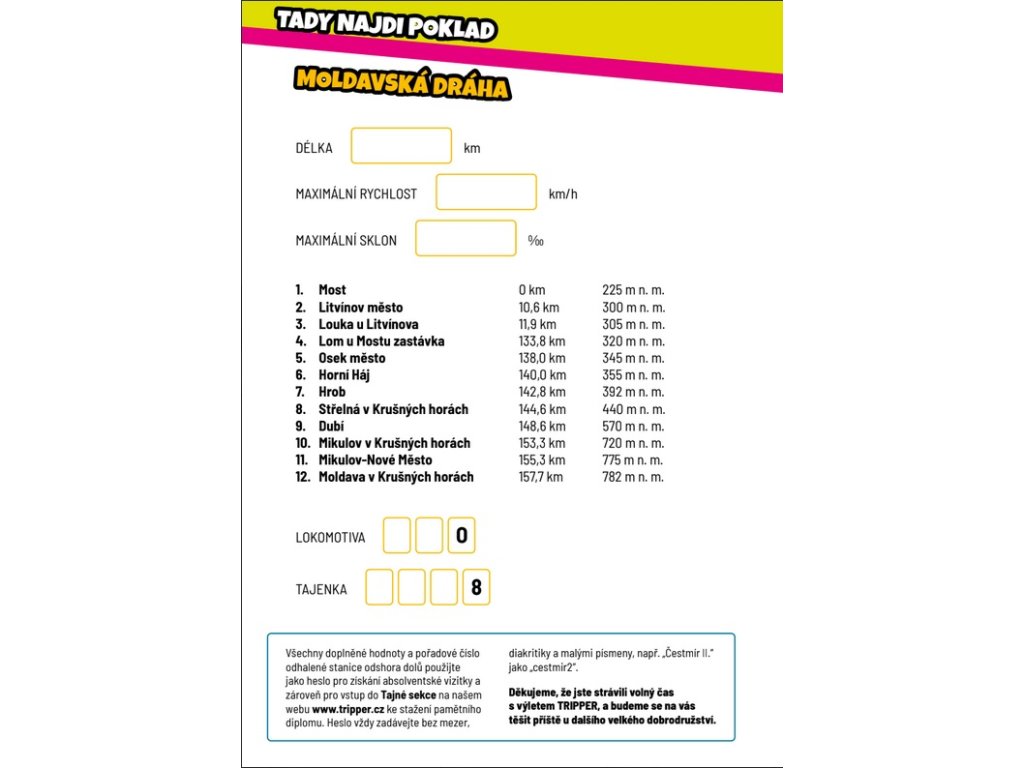 DOBRÝ DEN, KONTROLA JÍZDENEK. PŘISTOUPILI PROSÍM? Pokud jste si na dnešní jízdu lístek koupili, tak můžete zůstat v klidu a vyrazit motoráčkem z Mostu až na Moldavu. Tzv. Teplický Semmering nabízí zážitkovou jízdu unikátní horskou tratí a má za sebou už hodně dlouhou historii. Na trase dnešní stopovačky máte odhalit jednu konkrétní stanici a další technické údaje o této krásné trati. PÍÍÍÍSK, ODJEZD!