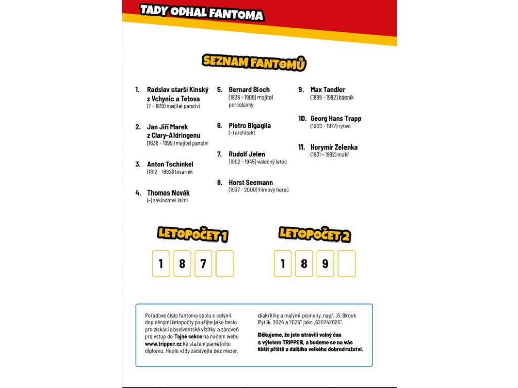 Všechna okolní města už svou trasu Tripper mají a letos, v roce 2025, se dočkalo i Dubí. Vzhledem k poloze města vás dnes čeká přímá trasa, takže se z cíle budete muset vrátit do místa startu. Vaším dnešním úkolem je odhalit fantoma výletu a doplnit dva letopočty, čímž získáte přístup do tajné sekce výletu na našem webu.